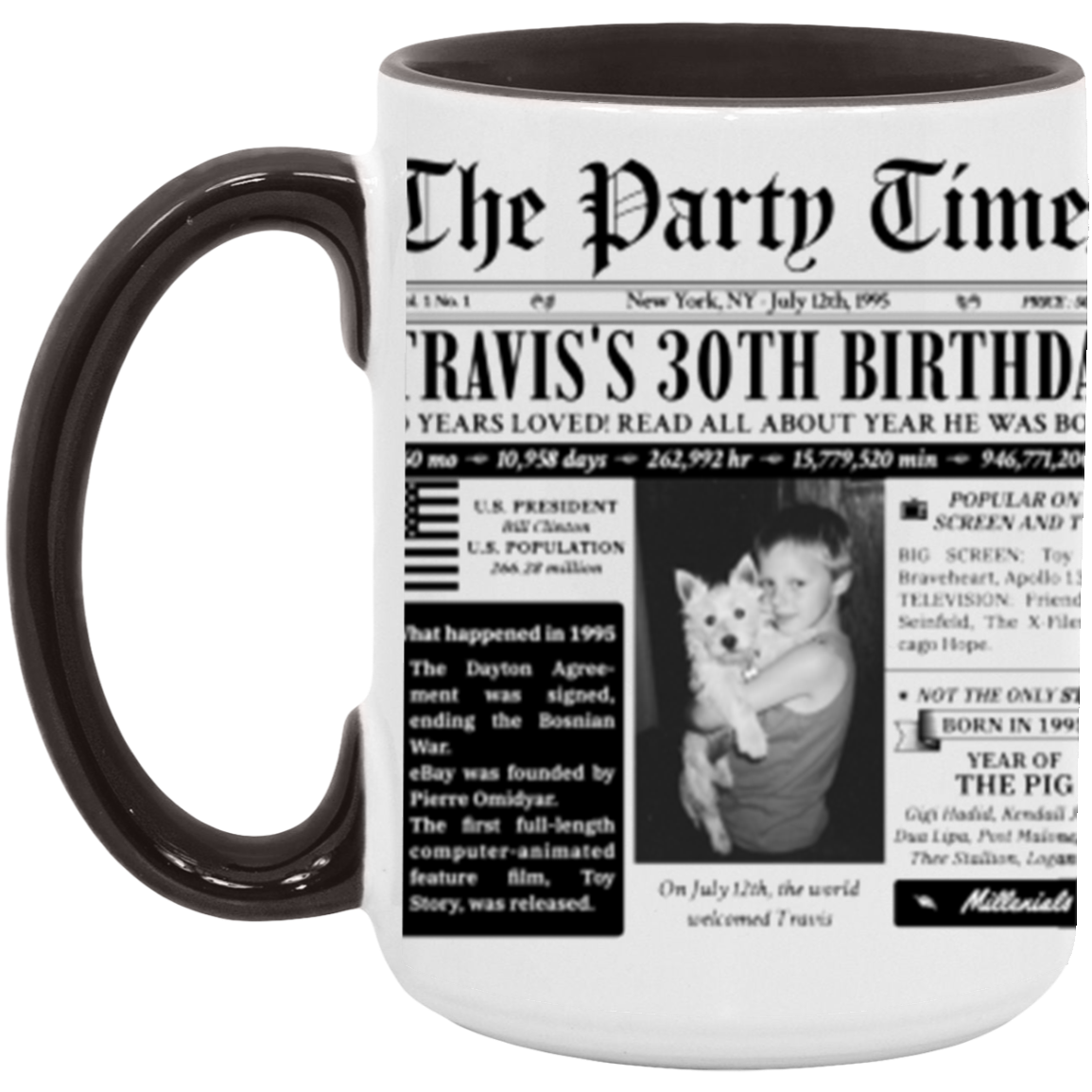 • High quality ceramic mug with two-tone rim, interior, & handle